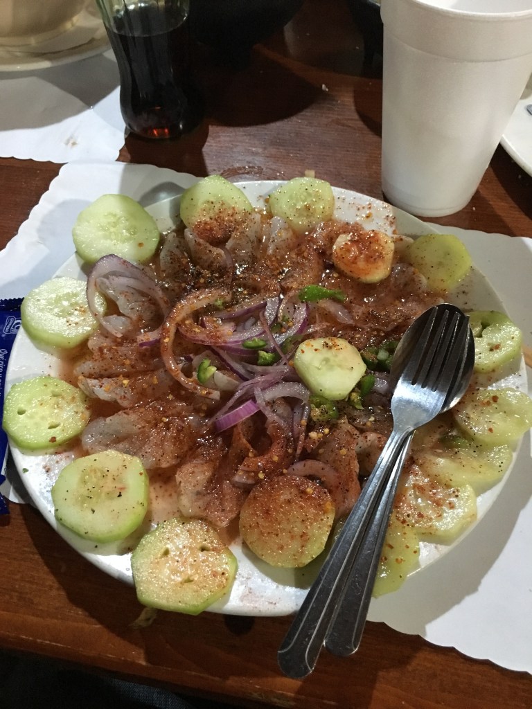 That first night we ended up having one of those destined-to-remember meals at a place several blocks off the beaten path that the hotel staff recommended called El Primo Nava. First off, the menu was huge with every variety of seafood from shellfish to Charlie tuna. Normally, I can find big menus intimidating as my FOMO kicks in and I consider all of the things that I might like better than what I ultimately end up choosing. But this time, I knew as soon as I saw Aguachile on the menu that was what I would have. Aguachile is raw shrimp “cooked” in the acidity of fresh lime juices with onions and chiles added to the brew. The mix is typically surrounded by slices of cucumber piled in such a way as to keep the lime juice in the middle deep enough to ceviche the shrimp. Tania and I first had this dish in Cabo and came back to LA looking for anyplace that would serve it. We did eventually find one place in Culver City, but it really didn’t compare. But, here it was again – this amazing amalgamation of briny seafood with chile and lime – and man was it ridiculous.